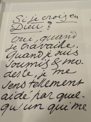 I was fascinated when reading Matisse’s riffs in his artist book Jazz, so calligraphically written and (seemingly) spontaneously composed with wit and candor. He asks rhetorically, “Do I believe in God?” His answer: “Yes, when I’m working.” He goes on: “When I’m open (when I submit) and I’m humble, I feel enormously aided by someone who helps me do things way beyond my capabilities.” Matisse admits to not knowing how to respond: the process is so mysterious and opaque to rational understanding, he imagines that someone is pulling a magic trick. He doesn’t know how to respond in kind: he can’t. So he feels like an ingrate.