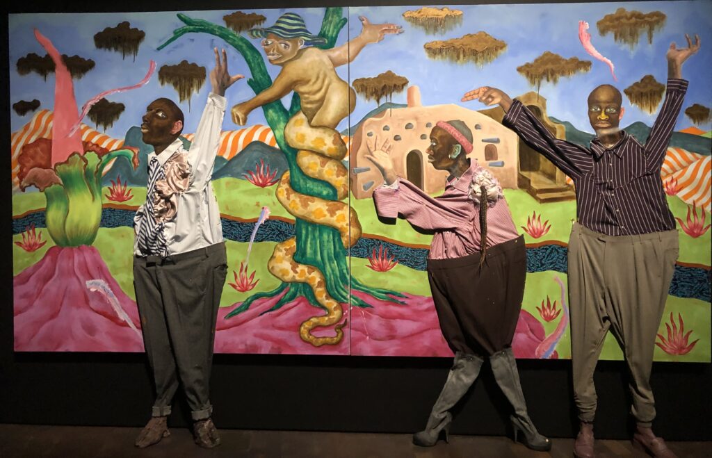 Even if that vision is extreme, will recede, too dark to be the whole truth, it speaks of complexities of experience. Two thinks at the same time. In Denver, I saw a superb exhibition by a young South African artist, Simphiwe Ndzube. His “Oracles of the Pink Universe” plays on Hieronymous Bosch’s “The Garden of Earthly Delights.” In his version, the familiar evil snake is transformed into Majole who, in his tradition, can signify a “welcome visitor, an ancestral incantation coming to pass along a message or a protector.”